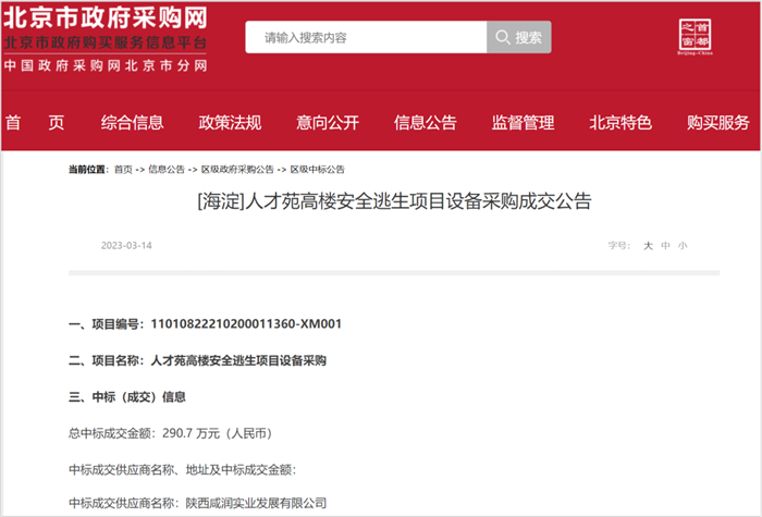 咸潤自主研發(fā)的“高樓應(yīng)急安全逃生智聯(lián)系統(tǒng)”以單一來源采購中標(biāo)北京市海淀區(qū)人才苑高樓安全逃生項目設(shè)備采購項目。這是我司近期的一項重要成果,也是我們在高層建筑安全領(lǐng)域的又一次重要實踐!