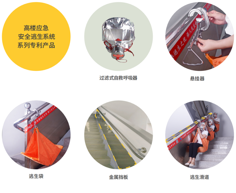 推薦產品:咸潤實業新一代“高樓應急安全逃生系統”配備更為安全的過濾式自救呼吸器,其耐熱防熱輻射,視野開闊,氣密性好,能很好地避免煙霧的吸入。