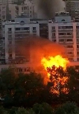 現場視頻可以看到,爆燃的火球騰空而起,爆炸聲多次響起。目擊者稱,站在街對面能感覺樓棟在震。